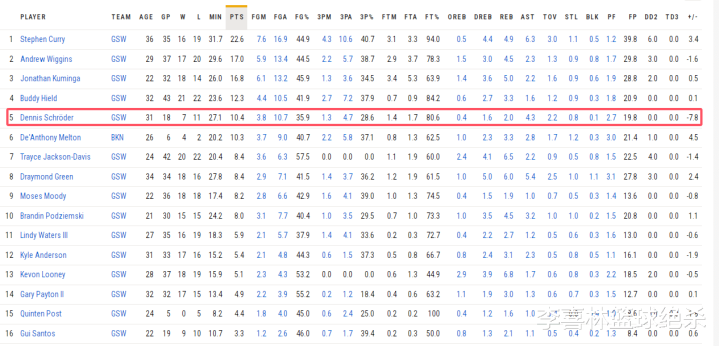 施罗德的场均正负值为-7.8,排名勇士全队最差。此外,自从施罗德加盟勇士,他的总体正负值是-140,排名联盟总计第473位,也就是全联盟倒数第八。这段时间正负值比施罗德还差的都是奇才队和篮网队的球员,这两支球队近期疯狂摆烂,处在连败当中。